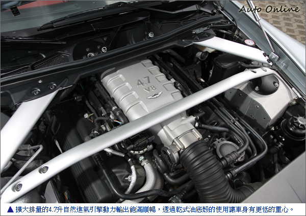 從引擎室裡的鋁合金拉桿、可以降低重心有效潤滑的乾式油底殼、鋁合金VH底盤與前後雙A臂的懸吊設定來看,你可以感受到Aston Martin致力最追求更好更優越的操控性。但我們也必須坦言V8 Vantage Roadster在定位上終究不是以極端激烈駕駛為主。與同公司的其他車系相較,它所呈現的調性會稍稍柔和一些。但如同在建中資優班考第五名一樣,在班上不見得特別出色,但走教室門口後依舊可以電翻一大票人。