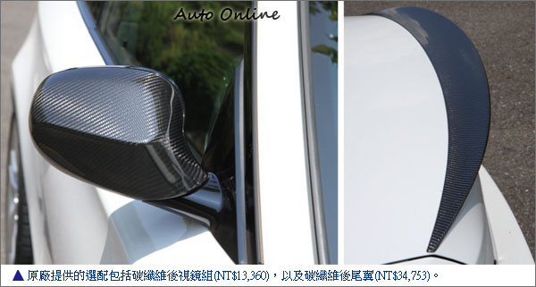 135i Coupe的車頭配置的是M款空力套件,進氣壩造型明顯比掀背車型誇張,不過這與正牌1系列M Coupe車上所用不同,倒是和M3有點幾分像。此外,在試乘車上,汎德特別在試乘車上加裝了碳纖維後視鏡,以及碳纖維小鴨尾翼,姑且不論實際的效果,這兩項選配套件確實起了畫龍點睛的作用,路人BMW“改裝車”,豈有不多看兩眼的道理?