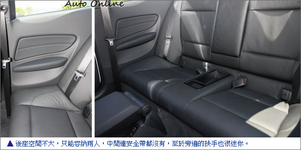 和一般雙門車相同,後座乘客進出得先將前座椅背向前傾倒,空間雖然還是可以容納成人乘坐,但有點擁擠。這部車是標準四座的設定,硬要擠進五名大漢當然是可以的,不過後座中央設有固定式置物處,而且沒有配置安全帶,即使乘客能夠忍受,駕駛也可能因此受罰。言盡於此,談論實用與否在這部車上沒有多大意義,購買這部雙門跑車,直接把它當成2+2的Fun Car就好了。