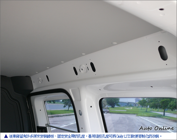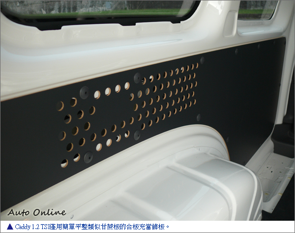 倘若你選購Caddy 1.2 TSI的目的不是運載大型貨物,Caddy 1.2 TSI的車廂結構上,留有許多原來安裝飾板、固定安全帶的孔座,善用這些孔座將後車廂做適當的攔架分隔,或許可將Caddy 1.2 TSI的用途,做更客制化的改裝。基本上,甚麼都沒有的車廂,就是可讓你輕意的將其做符合你自己使用需求的改裝。