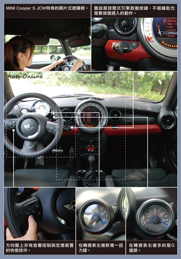 在之前,即已經試駕過MINI Cooper S,對其如同Kart般犀利的轉向能力,實是讚嘆不已。這次試駕的MINI Cooper S,雖然引擎動力與底盤懸吊,仍是維持原廠的設定,不過在JCW熱血的外觀件、內裝件加持下,儘管這些改裝皆無助於性能的提升,但心理想的這MINI Cooper S JCW,就是比未改裝套件的MINI Cooper S快上許多。