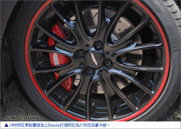 其中由Brembo打造的紅色JCW四活塞強化煞車卡鉗組,除了強化MINI Cooper S的煞車性能外,紅色煞車卡鉗的JCW徽飾,也散發出MINI Cooper S濃烈的性能味道。
