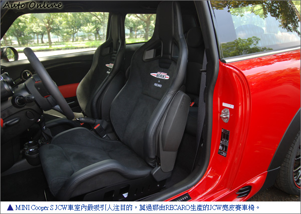 車室內最吸引人注目的,莫過那由RECARO生產的JCW麂皮賽車椅,深陷的座姿加上麂皮的防滑特性,對於車室的熱血氣氛營造絕對功不可沒,且這JCW麂皮賽車椅還是附有車側氣囊的賽車座椅。