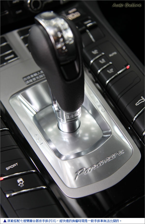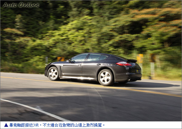 這類有Coupe氛圍的大型房車,很難不讓人跟性能聯想在一起,轉戰多彎的五指山,3.6升V6引擎輸出300hp最大馬力在接近兩噸車重的Panamera 4加速感覺只有順可以形容,沒有那種會讓人感到驚訝的兇猛加速感。原廠搭配七速雙離合器自手排(PDK),在進彎前的退檔變速箱會自動幫你補油減少頓挫感,超快速的換檔時間是一般手排車無法比擬的。在排檔桿旁邊有Sport模式按鈕,開啟Sport模式的最大差別在於變速箱的換檔時機跟油門反應,懸吊並不會因為按下Sport模式有任何改變,如果車主想要懸吊也可以跟著「硬」起來,可以選配主動式懸載調整系統(PASM)及動態底盤控制系統(PDCC),選配這兩套系統當切換到Sport模式時,底盤也會趨近於運動化的車身設定,過彎會有更直接的轉向特性。