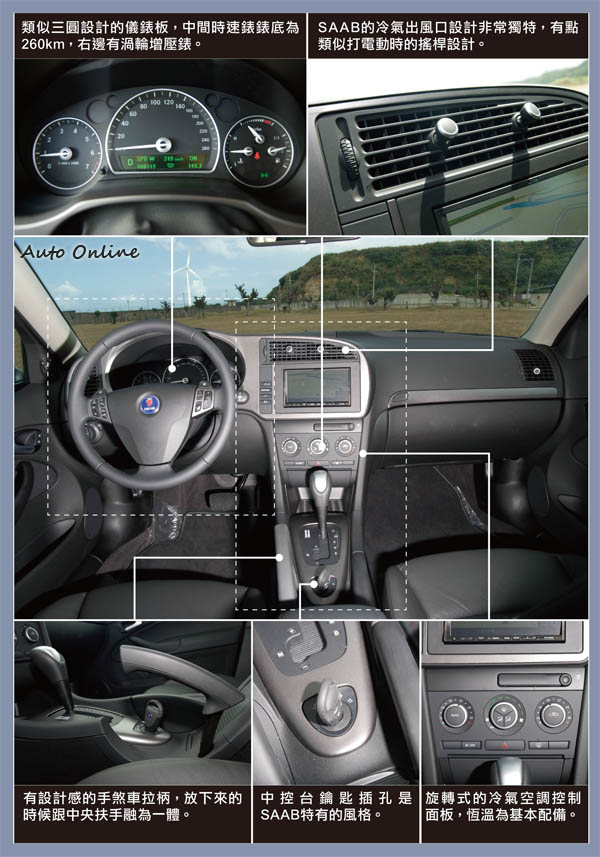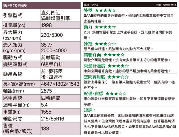 不確定的未來 負責任的代理商![]() 在SAAB未來還未確定的情況下試駕9-3 Griffin 2.0T有種五味雜陳的感覺,車輛的本質固然重要但車廠高層的決策才是真正影響車廠經營的關鍵。SAAB 9-3 Griffin 2.0T雖然屬於入門車款,但在220hp的動力加持下,足以應付台灣所有的路況,不管是山路激烈操駕還是高速巡航,或者遇到慢車超車,駕駛都可以感受到源源不絕的動力表現。雖然在高速巡航下,偏軟的懸吊有助於車身穩定跟輪胎不會因為彈跳喪失抓地力;但有一好就沒有兩好,較於舒適的懸吊設定在高速切換車道或者山路操駕讓車身變得非常不穩定,只有降低車速才能化解這因為懸吊設定帶來的車身不安定感。懸吊設定是筆者對SAAB 9-3 Griffin 2.0T小小的遺憾。