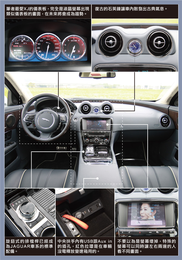 強勁的動力容易忽略後座感受![]() 其實早在去年本刊就已經試駕過JAGUAR XJ 5.0 V8L但當時的名稱比較長,全名為5.0 V8 LWB Portfolio,2012年新式樣把名稱簡化為5.0 V8L。從名稱來看可以看出引擎的形式為5.0升引擎 V型8缸,後面的L則是為長軸版的XJ。新式樣的XJ在引擎動力上跟改款前一樣,為JAGUAR第三代V8新動力系統,採用缸內直噴設計,可以爆發385hp最大馬力跟52.6kg-m最大扭力,這樣的動力表現對於一台1.7噸左右的龐然大物來說剛好夠用,不過以現在渦輪動力時代來看,這顆5.0升V8引擎可以加上渦輪,馬力輸出馬上翻漲(XJ 5.0另一款等級就配置雙機械增壓最大馬力為510hp)。