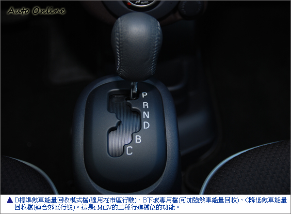 i-MiEV的排檔桿與一般自排車輛相當,由上至下分別是P停車檔、R倒車檔、N空檔、D標準煞車能量回收模式檔(適用在市區行駛)、B下坡專用檔(可加強煞車能量回收)、C降低煞車能量回收檔(適合郊區行駛)。