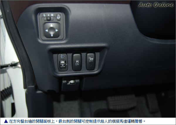 在儀錶右上角顯示的是里程數,行進間則會轉換成可行里程數。另外,i-MiEV的安全帶提示燈號,可是連後座都包含在內。在方向盤右邊的開關面板上,最右側的開關可控制提示路人的馬達運轉聲響,此馬達運轉聲是刻意模擬出來的,實際上的馬達運轉聲没這麼大。