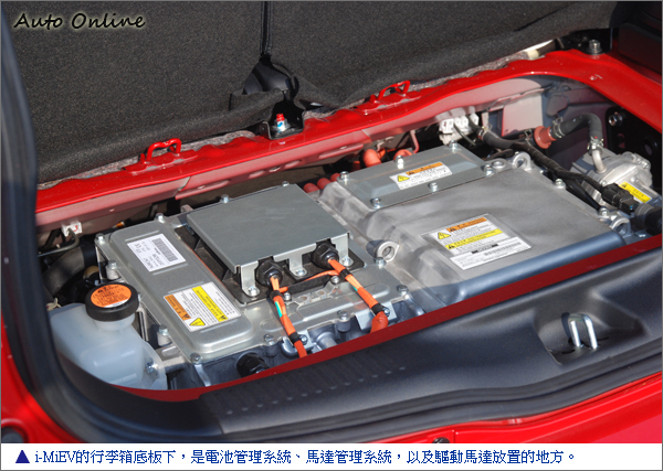 ▲在i-MiEV的電機室裡,主要放著12V的車用系統電池(獨立於驅動馬達電池)、電能冷氣機、煞車系統…等之空間。