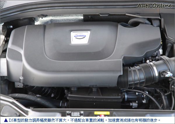 2012 VOLVO XC60 D5比較重大的改變就是動力的改變,其中最大馬力由原本205hp調昇為215hp,而最大扭力則由42.8kgm調昇為44.9kgm,並且在1500~3000rpm之間都能獲得這樣的扭力輸出,轉速域較過去最高3250rpm稍低。另外,車重也略為減輕,變為1870kg,不過原廠並沒有說明究竟是進行何種改良手段而得。在動力提昇、車身減重之後,可想而知,加速表現可以因此獲得提昇,如今新年式XC60 2.4車型0-100km/h的加速成績為8.3秒,進步了0.6秒,比想像中還多。順便一提,這次新年式車型,汽油車款的動力維持一致,並沒有跟隨柴油車款跟著調昇。