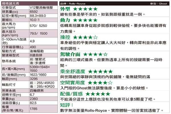 Ghost在Rolls-Royce旗下是最年輕也是入門的車款,但除非往同品牌的旗艦車款比,不然要在車中稱上一個「王」字也非難事。以前我會認為購買Rolls-Royce是一種炫耀財,當然要購買Rolls-Royce也必須累積到一定的財富,但經過這次的試駕我想擁有一台Rolls-Royce某種程度也是在檢視自己的成就吧!