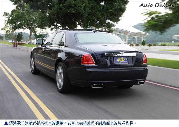 創新的部分自當來自於豐富的主被動安全防護與電子配備。在Ghost車上使用了新型的氣壓式懸吊系統,最主要的功能就是讓車室內保持平衡與穩定。透過大量的數據運算避震器每2.5毫秒進行四輪的獨立運算進行調整,最低還可降低25mm來調節車身高度。因此即便是乘客由左邊移動到右邊車輛即會根據不同的重量進行調整維持車身平衡,當然此時包含動態控制與防傾控制等諸多系也同步進行防護著。