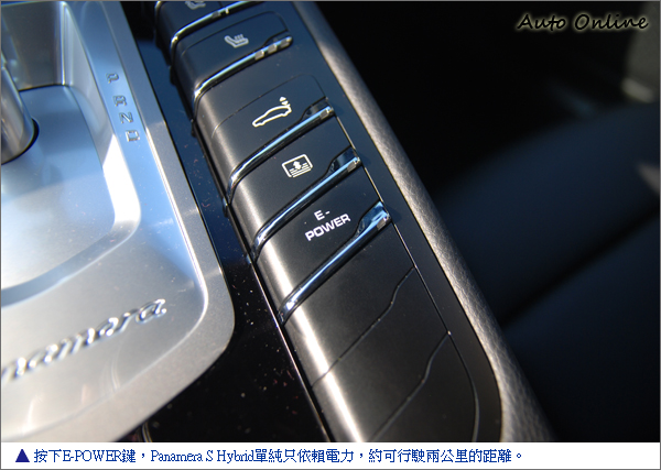 ▲Panamera S Hybrid的自適應減震器系統、保時捷主動懸掛管理系統PASM的控制、E-POWER的按鍵等均列在排檔桿的兩側平台上。