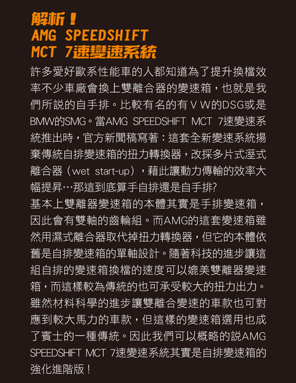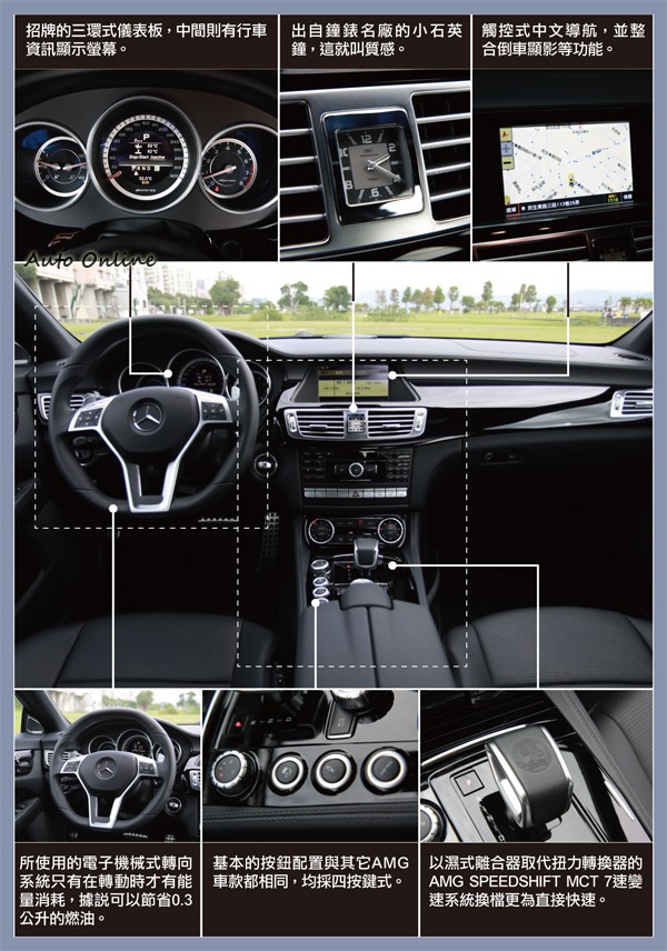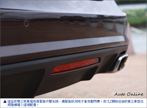 在移動的過程中我們將變速箱切換到C(Controlled Efficiency)模式,就在等紅燈時,CLS 63 AMG居然熄火了!原來這是Eco Stop/Start所致。雖然在很多車款都已經加裝這種在怠速會熄火的裝置,不過出現在AMG這等勁車上還是覺得不太搭。不過這樣的怠速熄火模式僅會出現在C模式,當切換到S、S+還是M模式時則不會作動。