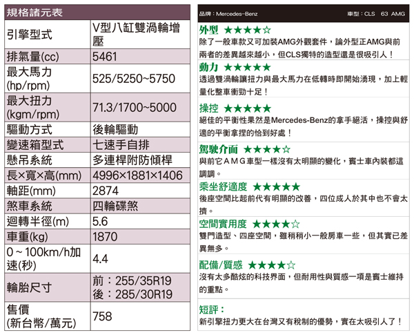 在台灣賓士的積極運作之下,媒體有更多的機會試駕AMG的性能車款。不過對於這台CLS 63 AMG而言對它還是較為生疏一些的。換上雙增壓的V8引擎象徵過去6.2升自然進氣的M 156引擎將逐漸交棒給 M 157入主到往後的AMG車型,渦輪增壓的輝煌時代再次宣告復甦!