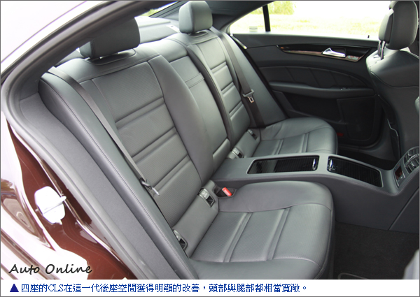 坐進車室內整體配置與其他AMG差不多,但與前代相比車室一項很重要的改變便是後座空間的放大。官方數據顯示CLS軸距拉長了20mm,達2874mm。前、後座肘部空間各增加了8/21mm,肩部空間增加了21/13mm。此外,行李廂空間也達520公升。實際乘坐的感覺在前後座都是正常坐姿的情況之下後座仍有相當充裕的腿部與頭部空間表現,更增添其實用性。