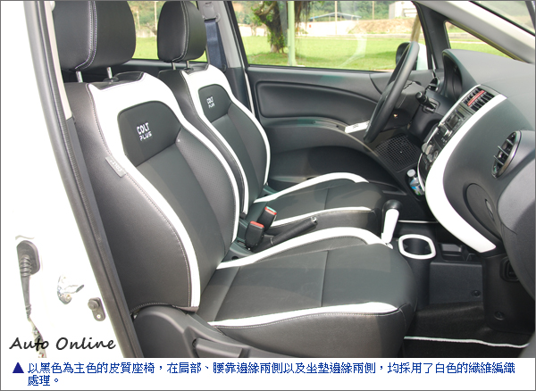 以黑色為主色的皮質座椅,在肩部、腰靠邊緣兩側以及坐墊邊緣兩側,均採用了白色的纖維編織處理。另外,在前車門上的電動窗開關白色面板,甚至是腳踏墊的白色收邊,更讓Colt Plus的車室呈現黑白分明的質感。