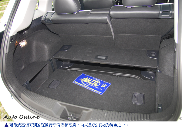 Colt Plus向來標榜的靈活可調式空間變化,在Colt Plus B+W特仕車上當然也沒少,仍保留了從後行李廂即可快速釋放後座椅背的One-Touch快倒後座椅控制拉柄、兩段式高低可調的彈性行李廂底板高度…等彈性的車室變化設計,說Colt Plus的車室空間活用程度是2房1廳還真不為過。