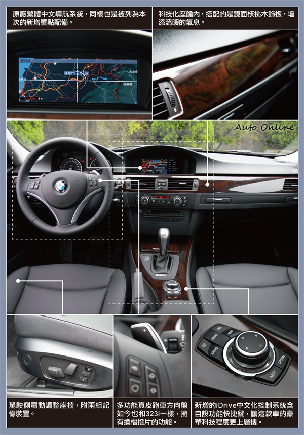 ![]() 總代理在年初時引進BMW 320i高效動力版,為使原本的產品賣相更上層樓,除了外觀換裝鍍鉻處理,內裝的Sensatec透氣真皮、鏡面核桃木飾板、電動玻璃天窗和雙電動記憶座椅,都在配備升級名單之中,同時也導入多項的BMW EfficientDynamics高效動力科技,包括:車輛能源管理系統、低滾動阻力輪胎和電子動力輔助方向盤等。