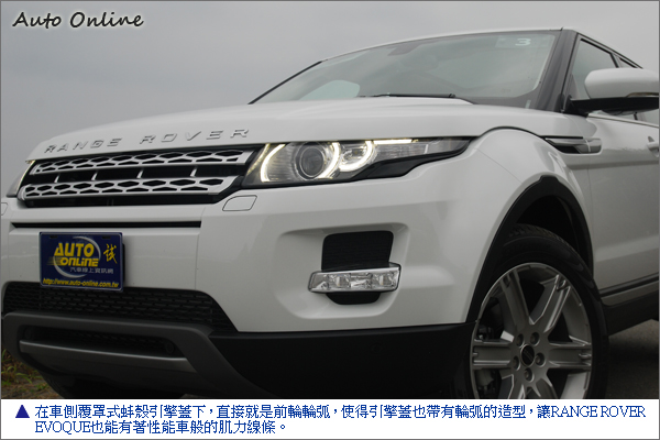 車首霧銀的水箱護罩,搭配環繞遠近雙燈HID頭燈的LED日間行車燈,即使在白天,RANGE ROVER EVOQUE仍可顯示出極具時尚般的刀鋒俐落外觀。蚌殼般的覆罩式引擎蓋,除了遵循越野吉普車的傳統外,同時也是LAND ROVER現行車款的標準化設計。