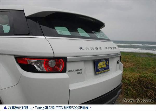 在Prestige車型上,加入了些些奢華元素的妝點,在車後的銘牌上,Prestige車型採用亮銀的EVOQUE徽飾,而在Pure和Dynamic車上,則分別採用黑底銀框和紅底銀框的EVOQUE徽飾,藉此不同色系同中求異的區分不同等級之車型。