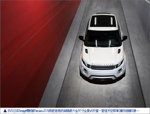 RANGE ROVER EVOQUE是LAND ROVER全新開發的新世代都會越野車。越野能力自當傳承LAND ROVER的傳統,雖然看起來一副斯文模樣,但越野性能在同級車款中,已是數一數二強的了。加上偏重都會使用的車輛設計,使其道路性能較以往更加頑強。