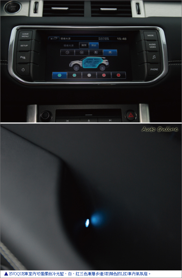 在RANGE ROVER EVOQUE車室內可選擇由冷光藍、白、紅三色漸層多達5款顏色的LED車內氣氛燈。音響系統更採用頂級發燒玩家指名專用的英國Meridian音響系統,搭配380W的擴大機功率和11支揚聲器含重低音喇叭,將RANGE ROVER EVOQUE車內營造出極出色的環繞音場。