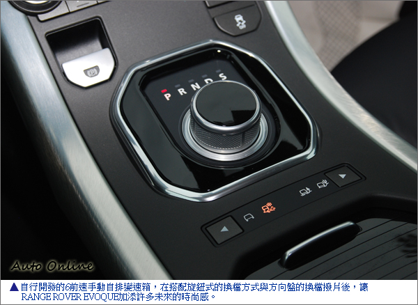 與FORD、VOVLO搭載這引擎的車款不同,RANGE ROVER EVOQUE不採用雙離合器的6速自動手排變速箱,而使用其自行開發的6前速手動自排變速箱。在搭配旋鈕式的換檔方式與方向盤的換檔撥片後,讓RANGE ROVER EVOQUE加添許多未來的時尚感。