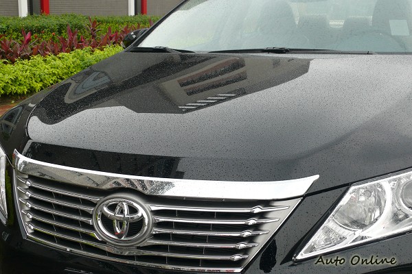 在車首部份,比照LEXUS ES以極簡高雅的頭燈設計,搭配鍍鉻的橫柵式水箱護罩,加上細節的點綴,營造出CMARY寬闊大器的尊貴氛圍。U型突起的引擎蓋設計,可算是七代CAMRY的特色造型。前保桿兩側平整化的設計,則帶有Prius先進未來的設計風格。
