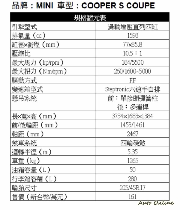 快速敏捷的性能![]() MINI Coupe一樣搭載兩款1.6升的動力源,這次試駕的MINI Cooper S Coupe配置了連續數年衛冕1.4-1.8升同級距年度最佳引擎大賞,最大馬力184hp,每公升可輸出115匹馬力的1.6升雙渦流渦輪增壓引擎。MINI Cooper S Coupe在Overboost狀態下,可在1600rpm的低轉速下達到260Nm的最大扭力,時速0到100公里加速僅需7.1秒,是目前MINI家族中加速最快的車款! ![]() ▲MINI Cooper S Coupe的1.6升雙渦流渦輪增壓引擎可爆發出184hp/5500rpm之最大馬力與260Nm/1600~5000rpm的最大扭力。MINI Coupe全車系配備Steptronic 6前速手自排變速箱,能依車輛行駛狀況判斷最佳換檔時機;而引擎的可變氣門正時科技,則可持續偵測油門踏板上的壓力,並且藉由控制汽門啟閉大小及時間,精確地調節進入汽缸的空氣,有效降低MINI Coupe的油耗。 ![]() ▲MINI Coupe全車系配備Steptronic 6前速手自排變速箱。在擁有強勁動力輸出的同時,MINI運用頂尖的節能科技,降低油耗及廢氣的排放。MINI Cooper S Coupe引擎的燃油缸內直噴搭配共軌科技的絕配組合,讓每一分能源都能有效的地被極致運用,讓MINI Coupe符合歐盟EU5所規範的油耗及二氧化碳排放標準。 ![]() ▲一般MINI該有的清晰、硬朗路面反應,MINI Cooper S Coupe也依然具備,但在過彎時卻又顯現出更多的穩定感,讓人有信心以更高的速度進入彎道。Gokart般的操控反應,一直是MINI的特色之一。MINI Coupe採用前麥花臣式後多連桿控制臂的懸吊設計,加上經典的寬輪距與低重心的配置,讓MINI Coupe得以發揮著名的穩定、靈活操控特性,使其在任何行駛速度下,都具有絕佳的過彎能力和循跡性能。