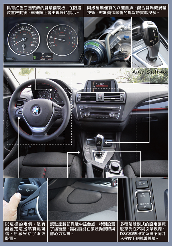 車輕、底盤穩,動力也不弱,操控不強也難,不過幕後的重要功臣,還包括同級唯一的後輪驅動設定、50:50的前後配重比例,以及新導入的八速手自排變速系統。新一代的BMW都可以切換多種駕駛模式,而118i Sport除了基本的COMFORT、SPORT和ECO PRO節能模式,還多出SPORT+模式,因此可以同時滿足追求節能的駕駛,以及熱血澎湃的快車手。在能源局的油耗測試中,118i Sport繳出綜合油耗15.2km/L的成績,相當不簡單。如果想試試身手,它也可以在DSC動態穩定系統退出後,讓人享受激烈的引擎反應帶來的快感。