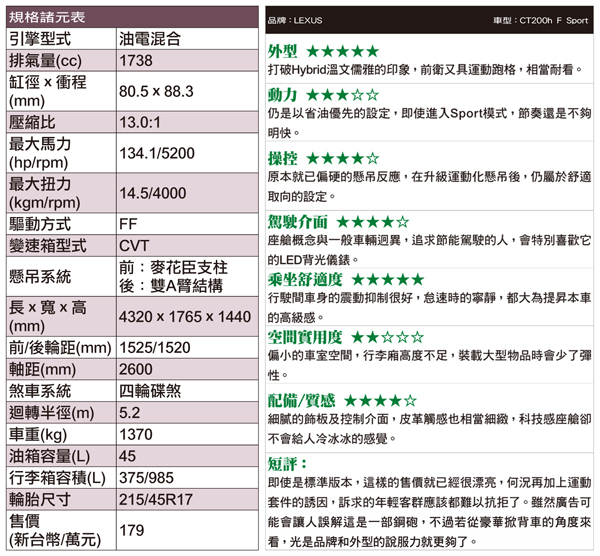 說到CT200h的外型,這是LEXUS旗下最小的車型,製造平台與Corolla相同,除了LFA,擁有整個家族中最具跑格與流線的車身。這次新加入的F Sport版,純粹標榜運動化的包裝,動力方面則維持原貌。