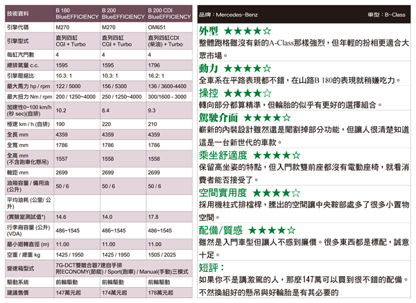 汽油好?柴油好?![]() ▲B 200 CDI 搭配七速自手排變速箱開起來相當順暢,但噪音似乎可以抑制的更好才是。賓士在車系的編成上顯得簡單不少,共有汽油兩款以及柴油一款。汽油的部分均搭載同一顆原廠代號M270 L4 1.6升的渦輪增壓引擎。藉由不同的調校分別有122匹與156匹的引擎出力。但無論妳是選擇147萬還是174萬的版本,三款車型均使用7G-DCT雙離合器7速自手排變速箱。 ![]() ▲B 180 與B 200 BlueEFFICIENCY皆採用原廠代號M270的1.6升引擎。而OM651柴油引擎在山路段受益於柴油車較大的扭力開起來自當相當順暢寫意。在平路上136匹的馬力也足以應付一般使用。但在行走的過程中由引擎室穿來的聲浪若你是細心一點的駕駛還是聽得見,是較容易被車主扣分的地方。加上17.6km/L與汽油的14.6km/L(B 180)14.0km/L(B 200)的油耗表現差異其實沒有太大,因此真要選擇要不選最便宜的入門款,不然B 200無論汽油柴油在配備與動力的輸出上其實都差不多。
