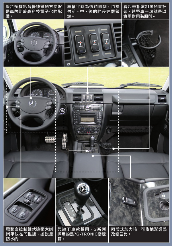 雖然這樣說好像有點侮辱了G-Class,不過在停停走走的道路開G-Class的感覺其實跟開一台堅達3.5的貨車沒啥兩樣,一樣搭搭的引擎聲,一樣高的重心,樸實無華的內裝,但沒關係,內行的就知道堅達爬不上的斜坡你一定可以,只是我們的主場不是在一般道路而已。