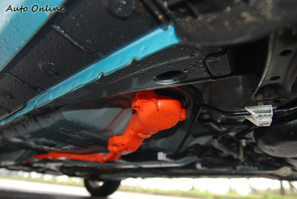 ▲Prius C的Hybrid電池以及油箱放置在後座椅下,特以高剛性鋼材環繞外圍,提供電池、油箱遭撞擊時的防護。