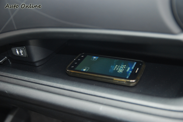 ▲副駕駛座的手套箱上緣也同時設有附加USB音源插槽的置物小格,讓播放音源的手機或是MP3有放置收納的所在。