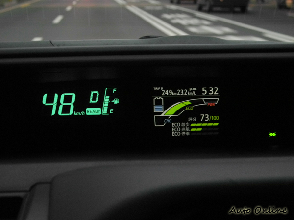 Prius C的Hybrid系統,可做完全電能動力的行駛,雖然隨著駕駛者踩踏油門的開度、控制車行的速度,都會影響到完全電動行駛的距離,但在時速50公里內可行駛將近3分鐘的實測成績,也算相當不容易了。