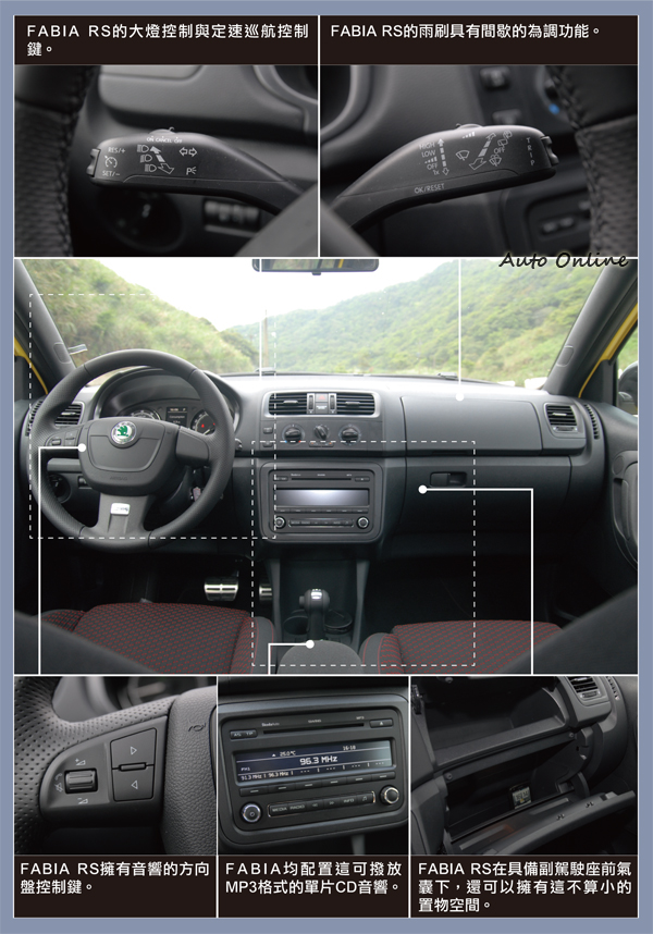 FABIA RS的配備與ㄧ般FABIA相差無多,均配置可撥放MP3格式的單片CD音響,且都內建AUX IN的外接音源插孔,可惜的是未具備USB的音源輸入方式,除了無法透過隨身的音源裝置直接撥放音樂外,亦無法同時透過USB對愈來愈多耗電的智慧型手機充電,我想這點倒是眾多智慧型手機使用者的共同心聲。