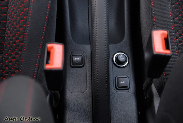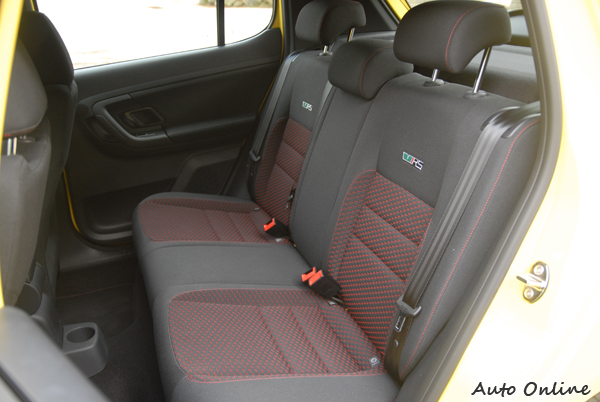 進入車室,最搶眼的就是那標有RS徽飾的前後座椅,以黑色為基底的紅色織紋跑車式布椅。其前座大腿兩側及腰部兩側的支撐性不俗,且讓乘坐在其上的人產生十足的信賴感。後座設計為兩人坐的座椅型式,雖然原廠仍安裝有三人的頭枕,不過就FABIA RS的車室空間來說,還是只乘坐兩人會比較適合。