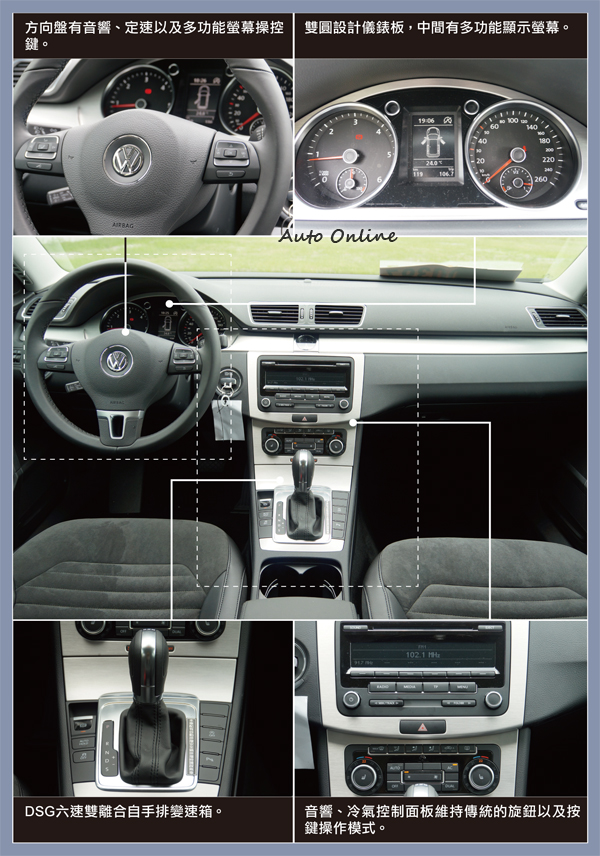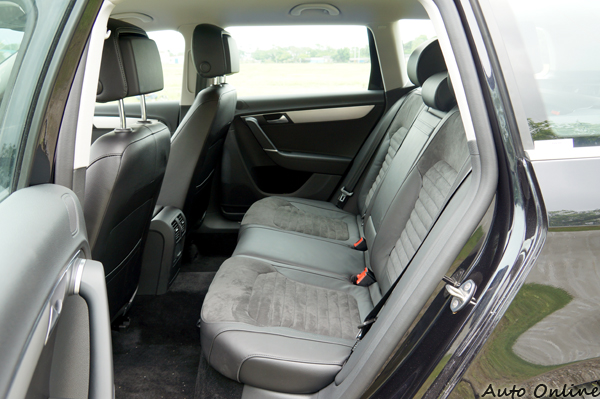 內裝依舊維持VW的一派作風,金屬飾板點綴中控台,座椅表面運用麂皮材質,讓車內散發出年輕氛圍。VW Passat Variant 2.0 TDI的影音設備維持傳統旋鈕式,並未配置全彩觸控式螢幕,冷氣恆溫空調為按鈕搭配旋鈕組合,使用上清楚好辨識,操作起來沒有甚麼太大問題。後座乘坐空間寬敞,頭部空間寬裕,後座乘客長時間乘坐依舊保有良好的舒適度,全家出遊加上行李都還能有不錯的乘坐空間表現。