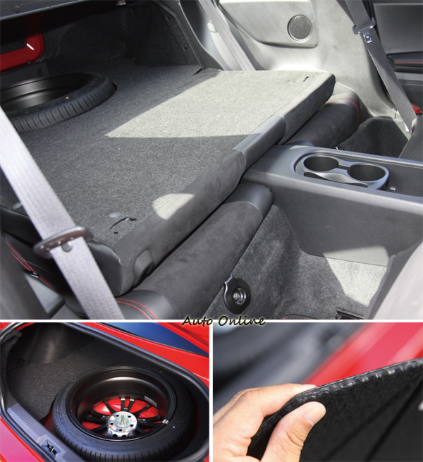 受到後懸吊設計影響,備胎上半部外露在行李廂底板上,也嚴重影響儲物功能,實際上多數人可能會直接移除,然後向原廠購買無備胎底板蓋上,這樣就能擁有完整的行李空間了。