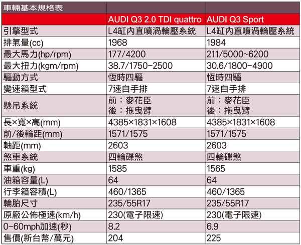 汽油順 柴油勁台灣奧迪此次共推出兩款汽油一款柴油共計三款的Q3在台上市。而官方安排的試駕當中我們分別試駕到177匹2.0 TDI與211匹的 Q3 Sport。但無論是何者皆標配S tronic七速自手排變速箱,透過密齒比多檔位的設計讓車輛獲得順暢不間斷的加速性。