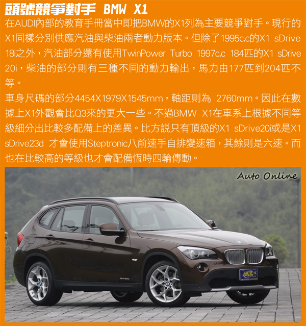 出乎意料的越野力![]() ▲小休旅搭配四驅系統其主要目的都不是為了越野。而是為了提升在一般道路行駛時的循跡性。在同集團資源共享的前提之下,Q3的底盤其實與VW Tiguan相同。像這樣的小休旅基本上越野能力都不會是主打重點。把它想成一台長得比較高、空間比較大一些的房車反而比較貼切些。因此很多人看到quattro就覺得它應該可以飛天遁地無所不能,但在資深越野玩家的心中其實沒有加力檔或中央差速器鎖定功能的四驅車基本上四輪驅動的目的其實不在越野,而是增加抓地循跡性而已,比較偏似速霸陸的四驅概念。 ![]() ▲全車系均標配235/55R17輪胎,但不同版本輪框造型也會有所不同。Max大話車壇過去在台灣談到豪華車最直接聯想起的品牌其實是雙B。在勵精圖治之後,現在的AUDI也經不再僅是老一輩人口中的四個圈圈牌,它不僅豪華,而且更帶有潮流時尚的味道。從Q3上市以來AUDI不跟你談車子,在第一波的文宣當中它跟你談設計、講理念。找來香港建築設計師Gary Chang與專精材料學的Oskar Zieta舉行設計講座。直白的這兩者與車本體其實沒有太多的正相關,Gary Chang甚至連車都不會開。但你必須佩服AUDI的也是如此。就是誰說車廠花錢辦講座一定就得車輛有相關?我就僅是想溝通一個觀念,塑造一個形象,這錢AUDI不但花得起而且也很捨得花。