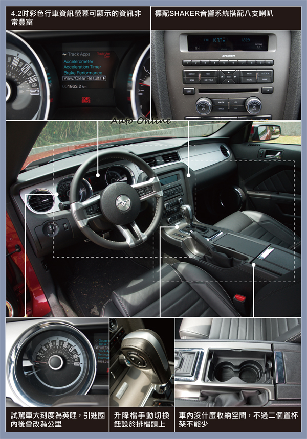 中控台上可以看到車廠為2013年式Mustang所提供的Shaker音響系統搭配八支喇叭,車上也搭載福特近年來投入相當資源研發的SYNC娛樂通訊整合系統,可透過置杯架後方收納槽內的USB或AUX IN端子與外部音源連結,或是藍牙無線連結方式撥打電話與播放影音檔案等。不過有些功能在非美國地區並不能使用,大家倒是可以期待年底配備全中文介面SYNC系統的新Focus,題外話就先不多說了。