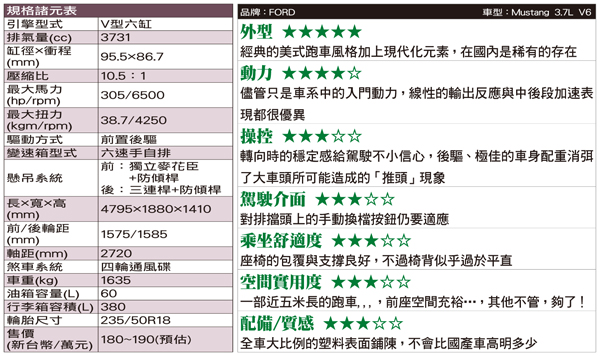 以美國幅員廣大的地理交通環境來說,對於大排氣量、大馬力車的需求相當普遍(甚至可說對何謂大排氣量、大馬力的認定與台灣也有很大差別),所以在這部野馬身上我們看不到什麼豪華鋪陳,但是在更多面向上,我們也終於有機會一睹美式風格的設計思維。二百萬元以內的預算可以讓你開著中小型歐系房車當個理性紳士,或是駕著野馬恣意馳騁,The choice is always yours...。