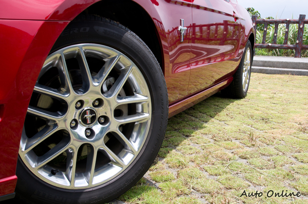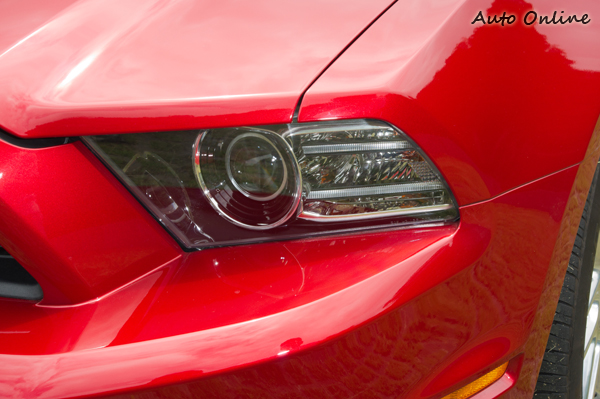 頭燈組設計除了HID氙氣放電主燈外,旁邊還有二條LED日間行車燈橫條。上下二段的水箱罩採取較為運動風的蜂巢格狀設計,中央大大的鍍鉻野馬徽飾是車迷心中的疾馳圖騰。輪圈則是18吋新七幅雙肋式樣,配胎為235/50 Pirelli P Zero Nero非對稱花紋跑車胎。