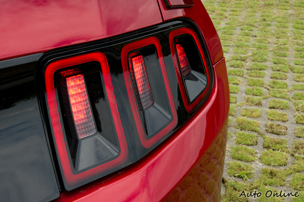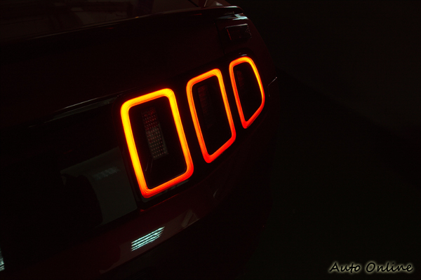 當按下車門解鎖鈕後,後視鏡下方會投射出一道野馬圖案的光芒至地面,前輪拱後方則有實體的野馬徽飾供車主(或路人)集中眼光焦點。車側下緣的下護板現在予以車身同色處理,看起來比較有統一的質感。三直式LED尾燈周圍反射鏡施以燻黑處理,外環則為序列式方向燈。二側尾燈透過高光黑色處理的飾板來整合,中間也不忘再放一個大大野馬徽飾(供後車瞻仰?)。