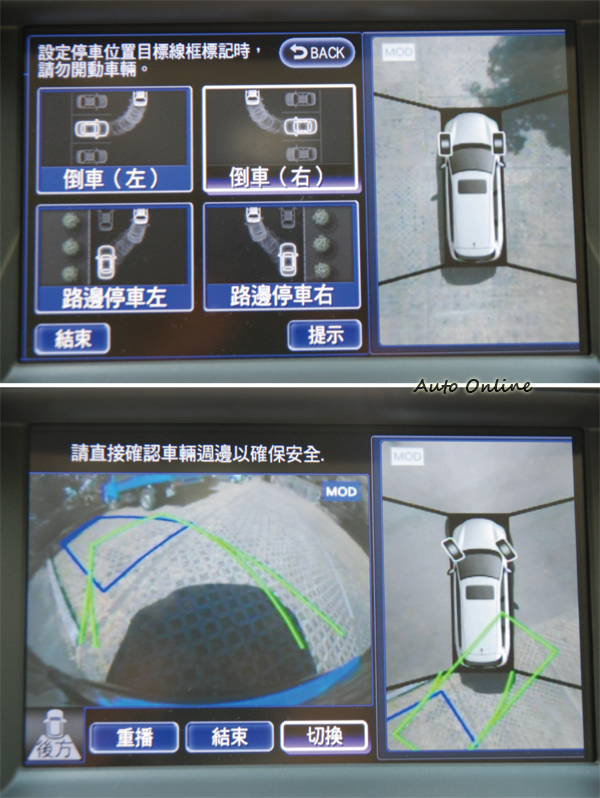 這次導入國內的車型,也將360度環景顯影系統納入配備範圍;這套系統是將車身周圍的四組超廣角鏡頭,合成為自車身上方鳥瞰的畫面,如今在JX車系上則有更成熟的應用。除了提供停車導引輔助,可讓駕駛設定倒車入庫或路邊停車的輔助功能,減輕停車時的心理壓力,還加入MOD動態物體偵測的功能,用色框標示並顯示車輛四週的移動物體,以提醒駕駛注意。實際使用時,這套MOD並沒有想像中那麼實用,因為無論停車或倒車過程,相信全世界的駕駛教練都會告訴你,盯著螢幕看絕對是危險錯誤的舉動!駕駛必須隨時留意四週和後視鏡的路況,此時即使系統發現有移動物而發出警告,也不太可能先低頭瞧瞧發生什麼事再做應變,或許MOD在極為昏暗的環境中可能派得上用場。