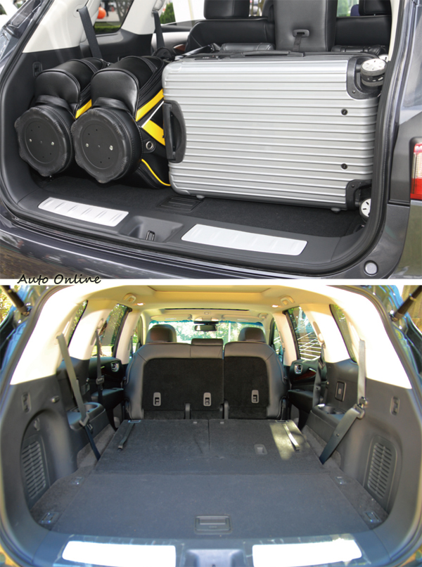 JX35的載物空間設計更是一絕,利用第二排座位的椅墊上掀設計,讓它放平時可以更向前面貼近,因此第二排椅背至後行李廂門的深度,最多可達到137公分,換句話說,直放高爾夫球具時,第二排的乘客座椅還能繼續保留。這樣的座椅機能也提供了乘客進出第三排時能擁有更寬敞的空間,甚至比R-Class、Q7這些車型更好,而且JX35在第二排安置兒童座椅的情況下,依舊可輕鬆進出第三排,真正是專為三代同堂同時出遊而設計。從數據上來看,JX35七人乘坐時,行李廂就有447公升的容積,五人乘坐與二三排躺平的情況,更分別達到1277公升、2166公升的程度,這些都已經超越了尺碼比它更大的其他休旅車。