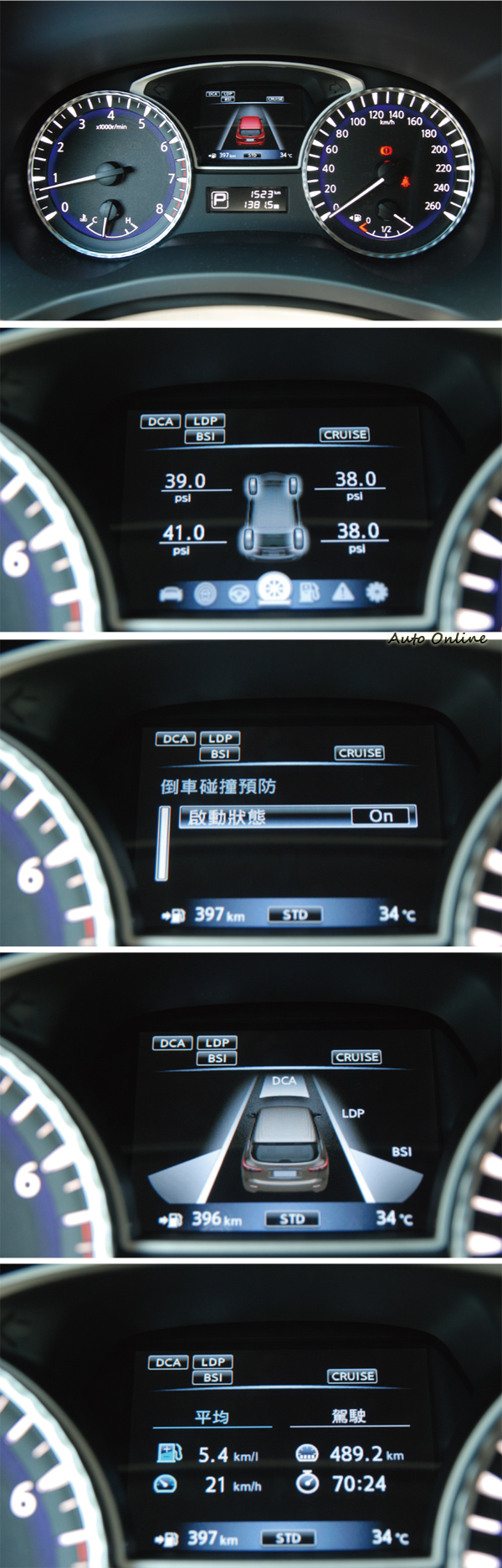 儀錶板上的4吋智慧型顯示幕看起來相當炫,透過3D化的視覺圖像,的確看起來更直覺,唯一可惜的是諸多主動安全系統啟動後,螢幕上仍只列出DCA、LDP、BSI...的文字,沒有跟著圖像化,對於不清楚英文縮寫意義的人,還不如直接用一個燈號代表「安全系統已啟動」來得簡單明瞭。